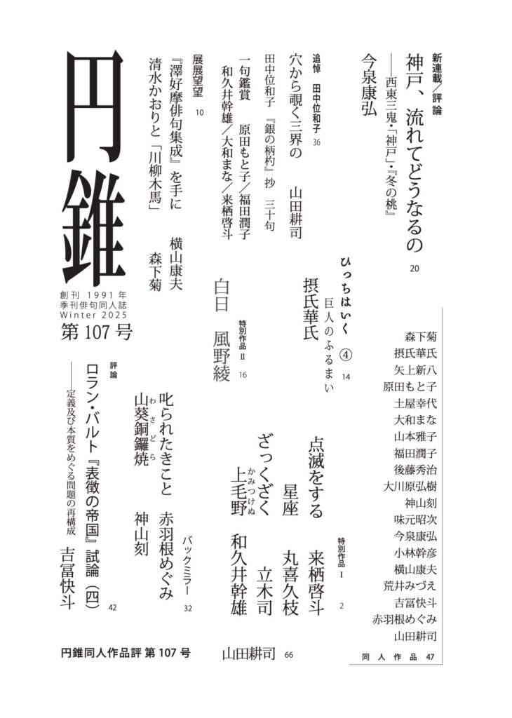 新鋭作品賞 第9回 円錐新鋭作品賞 逃げ水賞(伊丹啓子 推薦) 「転調」 有瀬こうこ →読む 白桃賞(山田耕司 推薦) 「発熱」 桃園ユキチ →読む 白泉賞(今泉康弘 推薦) 「鬼の子にんげん」 垂水文弥 →読む 選評 伊丹啓子 →読む 選評 山田耕司 →読む 選評 今泉康弘 →読む 俳句同人誌「円錐」第 105号誌上にて発表(2025年5月15日発行)